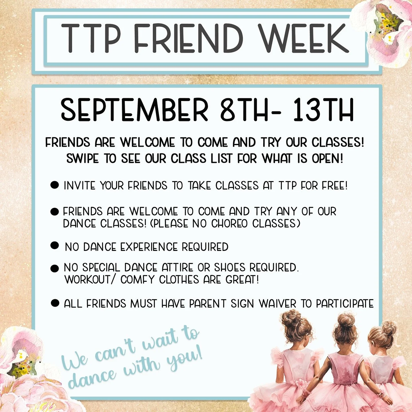 Join the TTP family to experience the best in dance instruction. Our expert staff of skilled, award winning teachers and choreographers offer years of education, technique, and performance skill. Dancers of all ages and levels of experience are welcome at To The Pointe Dance Centre. We offer a large variety of classes for everyone. Auditions are each Summer for our nationally recognized competition teams.