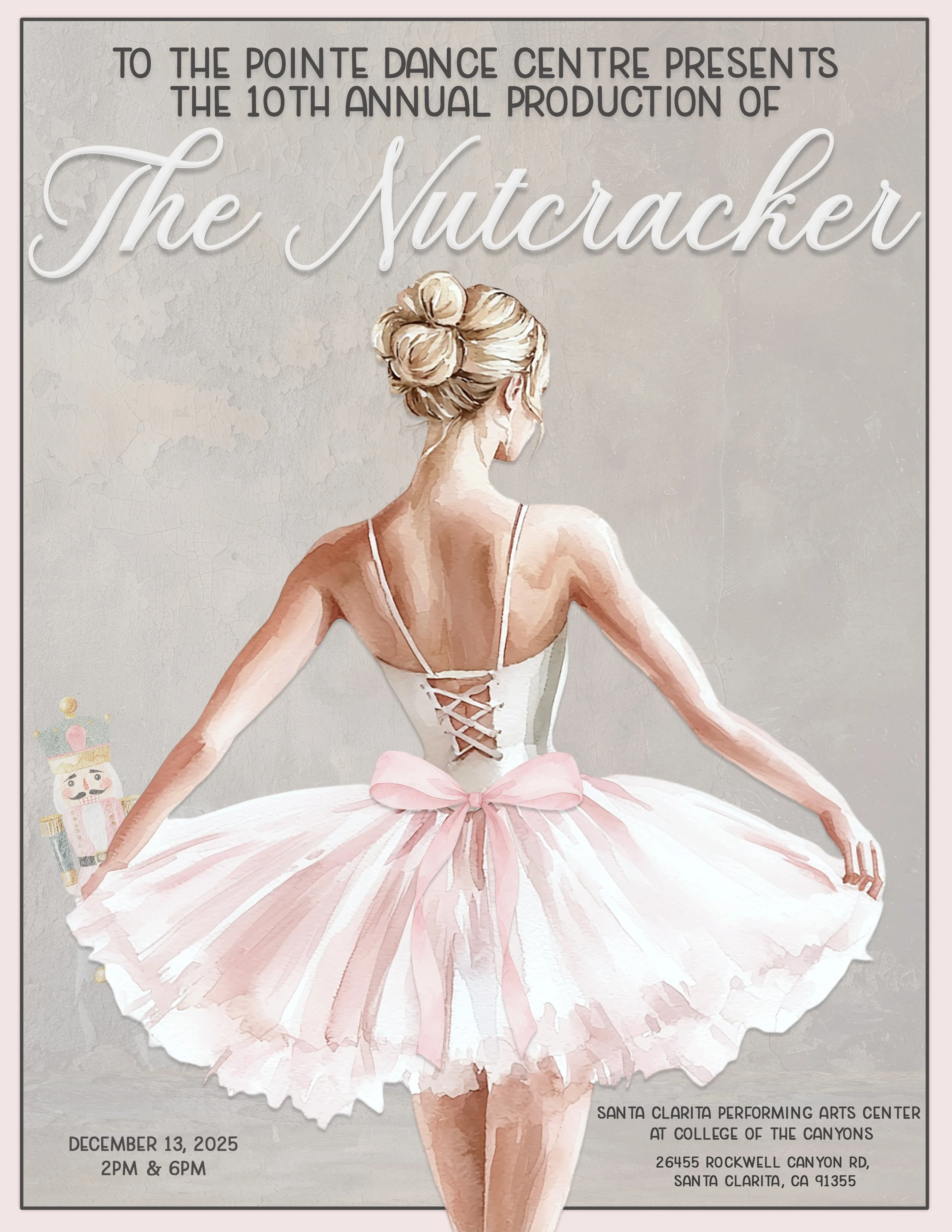 On behalf of To The Pointe Dance Centre (TTP), we would like to invite you to become a sponsor of this year’s performance of The Nutcracker, which will be presented at the Santa Clarita Performing Arts Center at College of the Canyons on December 13 at 2:00pm and 6:00pm. This will be TTP’s tenth annual presentation of the full-length ballet. Besides providing an outlet for our beautiful dancers to express themselves artistically, this also provides an opportunity for exposure to the arts for those within our community.